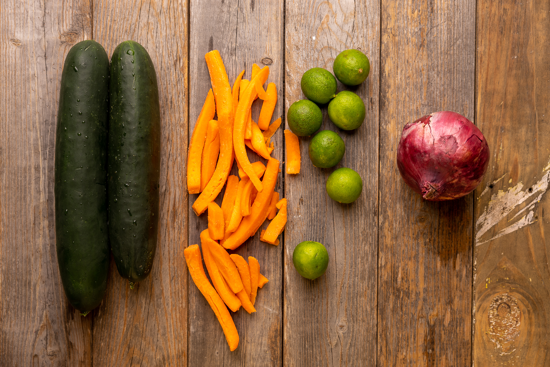 So I did the mistake of buying chopped carrots BUT if you can buy the shredded ones it will cut your time in half when prepping your dish. I also use lime because the onion taste better with it versus lemons.